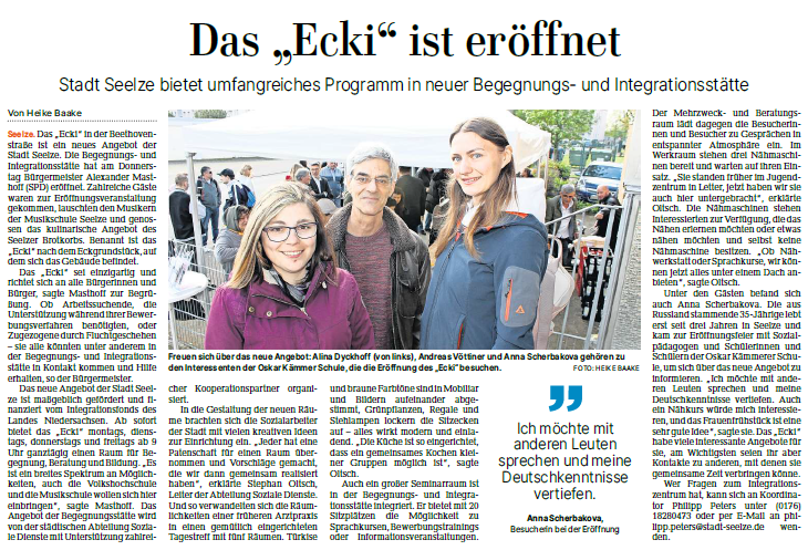 Das Ecki ist die neue Begegnungs- und Integrationsstätte der Stadt Seelze an der Ecke Beethovenstr./ Heimstättenstr. Gefördert vom Integrationsfonds des Landes Niedersachsen bietet die Stadt Seelze neuen Raum für Begegnung, Beratung und Bildung für alle Bürgerinnen und Bürger.